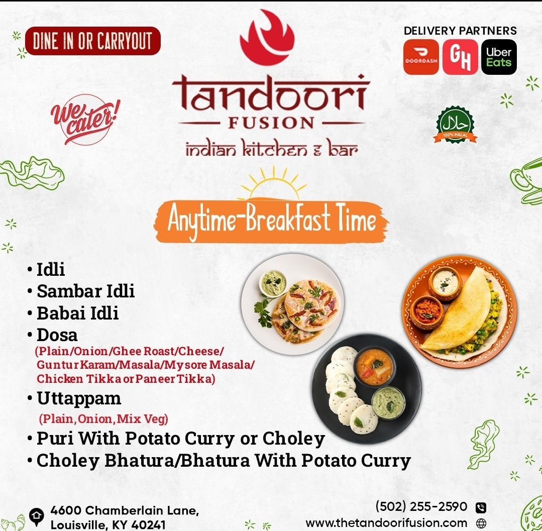 Introducing the menu at Tandoori Fusion - Indian Restaurant, where traditional Indian cuisine meets innovative flair. Located at 4600 Chamberlain Ln, Louisville, KY, this culinary gem offers a vibrant experience that excites the palate. Every dish, from the creamy Butter Chicken to the robust Lamb Biryani, is crafted with authentic spices, ensuring a memorable dining experience.